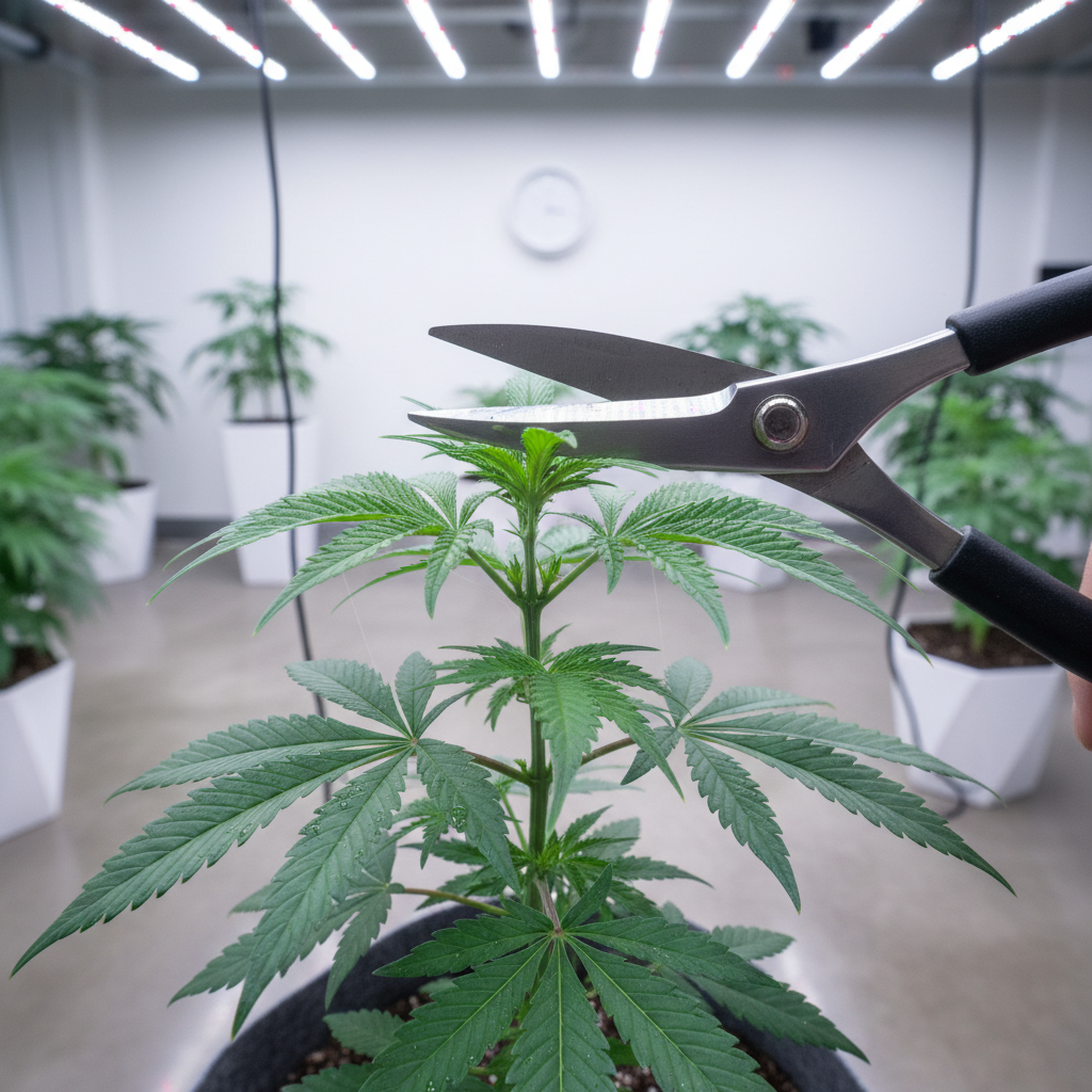 Step 1: Identify the cutting location. Locate the newest growth tip (apical meristem) above the 4th or 5th node set. The cut should remove only the growing tip while preserving the upper fan leaves.